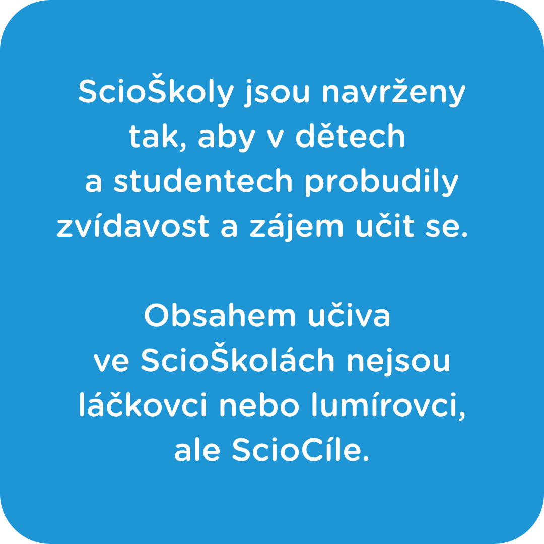 Svět, ve kterém budou dnešní děti žít, bude jiný. Umělá inteligence, rozšířená realita, robotika, autonomní automobily, biotechnologie nebo genové manipulace jim otevřou nové příležitosti, ale také je postaví před nečekané výzvy. Výhodu budou mít ti, kteří jsou zvídaví, umí se učit, rozumí sami sobě i druhým, dovedou spolupracovat, jsou odolní, otevření změnám a mají odvahu vzít budoucnost do vlastních rukou. Přesně takoví by měli být absolventi ScioŠkol.